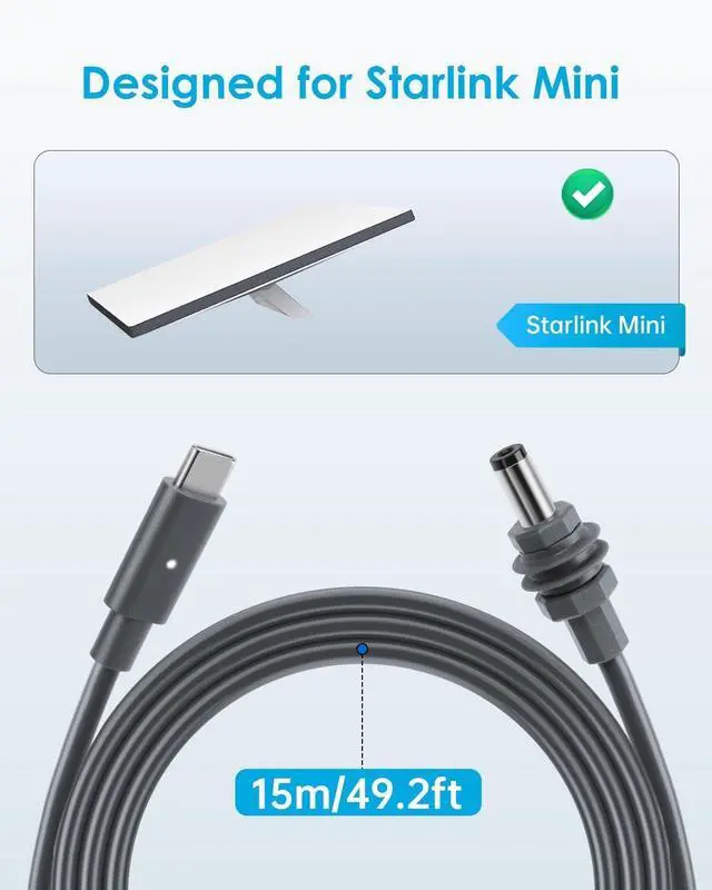 ^^ Waterproof DesignThe Starlink Mini Type-c to Barrel Jack Cable features USB-C male and barrel jack (DC) male connectors with a proprietary waterproof gasket and high-quality PVC casing, ensuring reliable performance in all weather conditions. ^^ Easy InstallationThe DC Power Cable Direct to USB-C for Starlink Mini is made of high-quality 18AWG material wire for stable power transmission and easy installation. Simply plug it into the USB-C port for immediate power supply. ^^ Customer Service Assurance Enjoy peace of mind with our commitment to quality service. We are always available to assist you with any questions about our Starlink replacement cable.