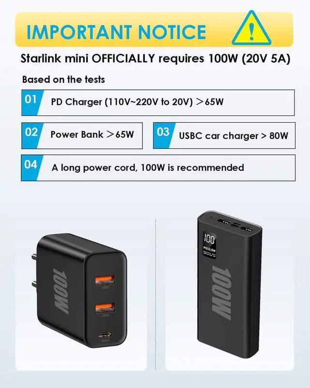 PD Smart Chip Integration The Starlink MINI USB-C to DC power cable is integrated with a PD Smart Receiver Chip, ensuring a 20V output on the DC barrel jack when connected to a compatible PD Type-C power supply. ^^ Indicator+100W PD Source Compatibility The power supply is 100W+, and the indicator is steady on. Power <100W, indicator blinking (Note that indicator blinking indicates power <100W, but the starlink mini may still work. Works with 100W + PD power banks to provide stable power supply for the Starlink Mini antenna, achieving optimal performance with 100 watts of output power (20V 5A).