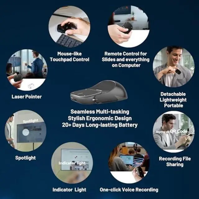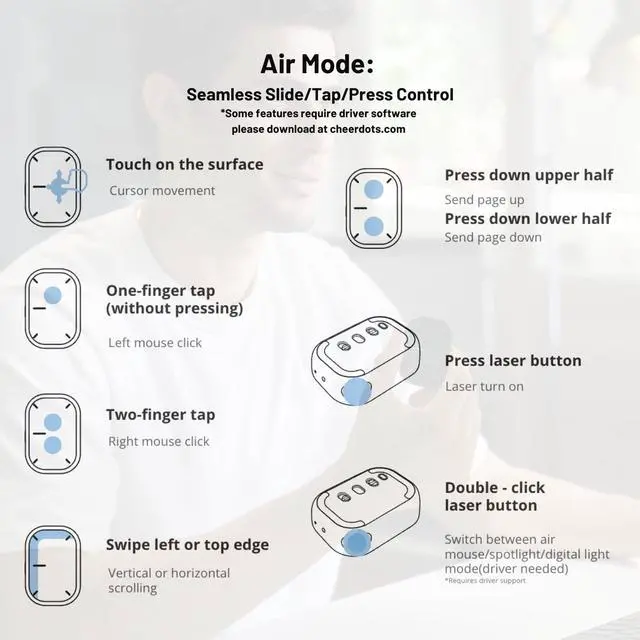 Unique Multifunctional Detachable Air MouseCheerdots2 Air Mouse comes with a stylish magnetic detachable design. It's an air mouse, wireless touchpad, presentation clicker, and recording pen all in one. Its upgraded ergonomic shape fits your hand perfectly and responds to natural hand movements. Weighing only 70g, you can carry it around in your pocket for on-the-go use. ^^ Ultimate Presentation Clicker with Laser PointerCheerdots2 Air Mouse is an ideal assistant to have in your meeting room, classroom, or lecture. It offers two modes of operation: Desktop Mode and Air Mode. In desktop mode, it serves as a regular air mouse with added touchpad features. In Air Mode, it transforms into a handheld smart device controller and professional presentation remote clicker with two content highlighting options. You can tap or slide the surface to move the cursor, slide the side to flip the pages of your presentation and switch between spotlight and digital light to highlight what you are saying. ^^ Voice RecordingThis feature is accessible in both Desktop Mode and Air Mode and requires the installation of a driver software, please download the software at Cheerdots. com ^^ Long Distance Laser PointerBy pressing the laser Button, the device can easily release an intense red laser to attract more attention to your presentations and lectures. ^^ Bluetooth Connectivity & Long Battery LifeCheerdots2 can be connected to Bluetooth in a flash and has a long battery life. It is equipped with a Type-C charging port, a single charge can be used for 20 days, which is very suitable for use on the go. ^^ Software CompatibilityThe Driver Software supports MacOS 10.15 +, and Wins10/11.