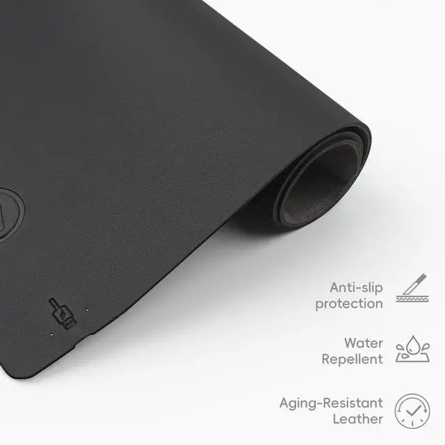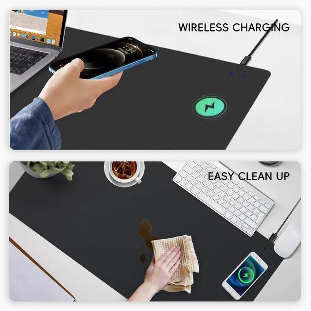 SPILL-PROOF WATERPROOF EASY CLEAN SURFACE: The desk pad is made of waterproof and durable PU Specially engineered surface effectively protects against accidental drink spills and moisture damage, keeping your desk safe and dry. ^^ SUPER SMOOTH SURFACE & NON-SLIP BASE: Made of premium texture and smooth PU leather surface, the mouse glides well over it, optimized for fast movement while maintaining excellent speed and control; Anti slip wool felt base material base that creates a strong grip on your desk, preventing any unwanted movement during intense working. It can fit well on the desktop, and can also be rolled up for carrying and storage. ^^ RIGHT SIDE WIRELESS CHARGER CHARGING MOUSE PAD: Left-handed Users, The right-side wireless charging port is ergonomically designed to align with the natural habits of left-handed users, allowing them to charge devices seamlessly while operating the mouse with their left hand, minimizing arm movement and reducing fatigue.