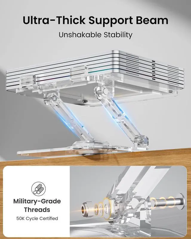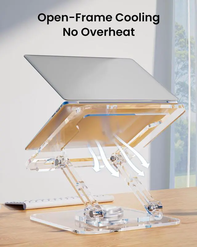 ^^ Premium Clear Acrylic Build Made from sturdy Class-A acrylic, this clear laptop stand adds a modern, minimalist style to your workspace while keeping stability and durability. ^^ Enhanced Cooling Ventilation Open, elevated design promotes airflow around your notebook; helps prevent overheating, ensuring smoother performance and longer device life. ^^ Stable & Protective Non-slip silicone pads secure your MacBook or laptop, while smooth edges prevent scratches; supports 1016 inch devices including MacBook Pro/Air, Dell, HP, Lenovo. ^^ Multi-Purpose Compatibility Works as a laptop riser, MacBook desk stand, tablet or projector holder; ideal for offices, kitchens, classrooms, or presentations for versatile everyday use.