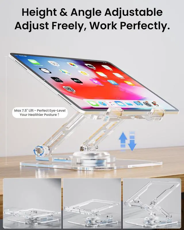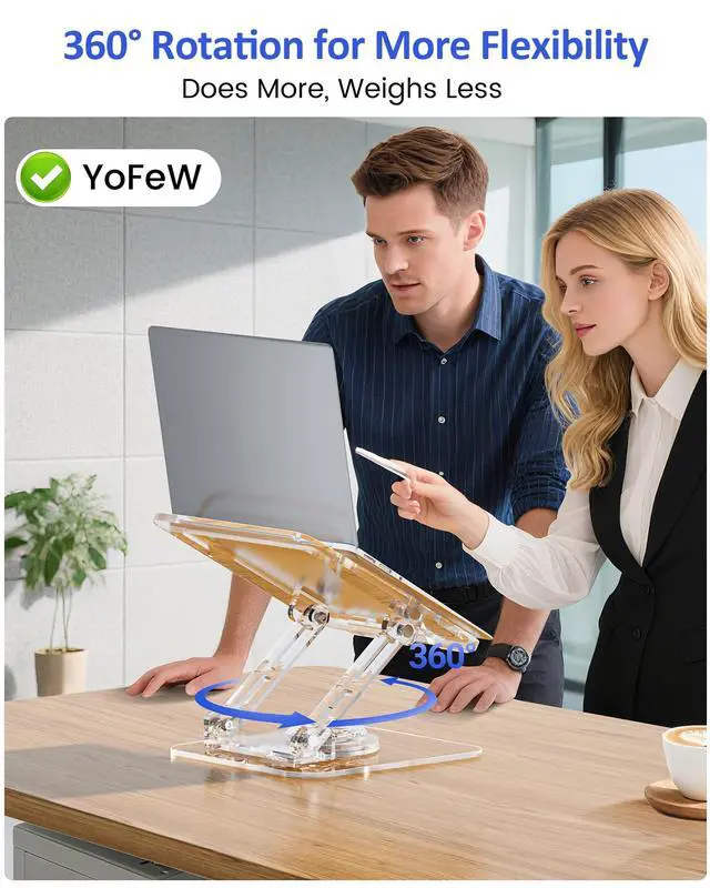 Ergonomic Adjustable Design Raise your laptop to eye level with flexible height & angle settings; reduce neck, shoulder, and back strain for healthier posture during long desk work. ^^ 360 Rotating Base Smooth swivel lets you easily share your screen in meetings, adjust angles while multitasking, or collaborate with colleagues without moving the entire stand. ^^ Foldable & Portable Compact design folds flat to slip into your bag; perfect laptop stand for desk, office, home, travel, or coffee shop use without taking up extra space. Folds to 1.57", just 1.9 lbs, fits in any bag.