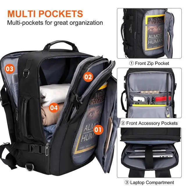 Multi Pockets: This flight essentials travel bag provides 3 spacious compartments for easy organization. 1 front compartment design with multiple small pockets to help keep your items neatly organized. 1 main compartment offers generous space for storing your essentials like clothing. 1 separate laptop compartment that fits 16 inches laptop and 11 inches iPad. 1 side pocket is also included for easy access to a water bottle or umbrella. ^^ Comfort and