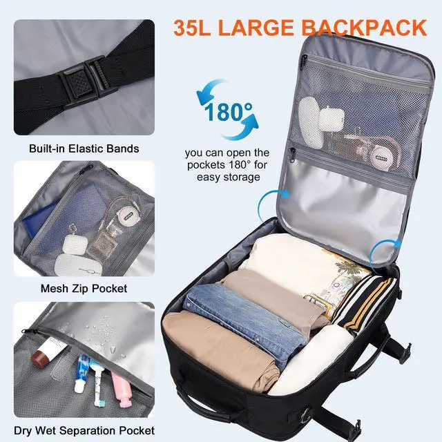 Size: 12.4 inches (L) x 8.5 inches (W) x 18 inches (H). The main compartment of this carry on personal item backpack is designed with a convenient 180 flap opening, making it easy to pass through security checks. It meets the requirements of most airlines, making it an ideal choice for your trip. ^^ Shoe Compartment and