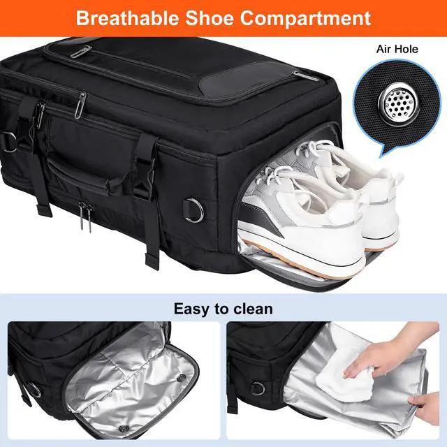 Wet Bag: This travel backpack features a pocket at the bottom designed for shoes, ensuring they are separated from other items. The shoe compartment is equipped with two vents to reduce shoe odor effectively. The backpack also features an integrated wet bag in the main compartment, which is made from premium and water repellent material. It is specifically tailored to separate your dry and wet items, ensuring that they are well organized within your luggage.