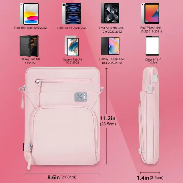 Perfect Fit Internal size: 10.6" 7.6" 0.7". Compatible with iPad Pro 11" (5th1st Gen, M4/M2/M1, 20182024), iPad Air 10.9" (7th4th Gen, M3/M2, 20202025), 10.5" iPad Air, iPad Pro with Magic/Smart Keyboard Folio or Logitech Slim Folio Pro Case, Microsoft Surface Go (3/2/1), 10.2" iPad, 9.7" iPad Pro/Air, iPad Mini (17), 10.1" Samsung Galaxy Tablet, and more. ^^ Excellent All-Round Protection CornerArmor patented design at the bottom absorbs shocks like a car airbag. A thick, soft protective ridge around the interior and dense padding safeguard against scratches, bumps, and drops. Made with premium YKK zippers and water-resistant, wear-resistant polyester for long-lasting durability. ^^ Smart Storage Space Main compartment fits your tablet, plus an extra pocket with dedicated pen holder for small accessories like your iPad Pencil, charger, cables, or phone. Keep everything organized and easy to access. ^^ Slim & Easy to Carry 3-in-1 design with detachable shoulder strap and ergonomic back handle for versatile carrying options. Slim and lightweight, it fits easily into a backpack, messenger bag, or briefcase. ^^ Friendly Service Guarantee We provide a 24-month worry-free warranty and responsive customer support.