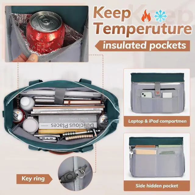 LARGE CAPACITY & MULTIPLE Pockets- The large main compartment of this teacher laptop bag with 10 inner pockets could easily hold all your daily necessities in an organized way, including padded compartments that can accommodate 15.6 -inch computers and 12.9 -inch iPads. Insulated pockets on both sides are designed for drinks or coffee storage and keep cold or warm for hours.