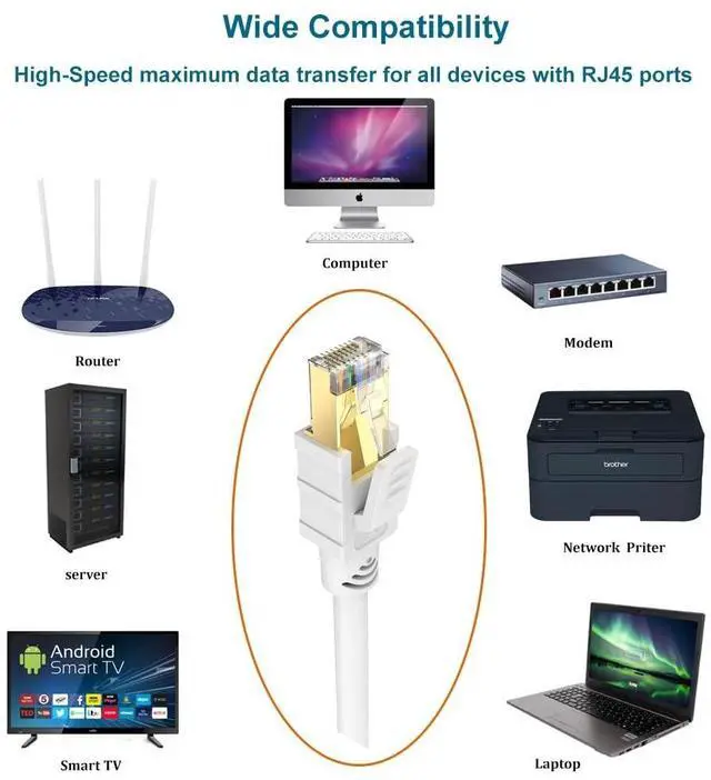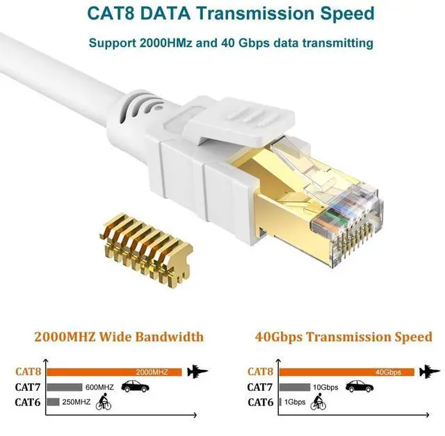 Supports bandwidth up to 2000MHz & transmitting data at speeds of up to 40Gbps; Connects to LAN/WAN segments and networking gear at maximum speeds; guarantees high-speed data transfer for server applications, cloud computing, and HD video streaming. ^^ Backwards compatible with CAT5, CAT5e, CAT6, CAT6a and CAT7 equipment; Perfect for Laptop, Router, Modem, Switch, Hub, DSL and network attached storage devices, PS2, PS3, PS4 and game boxes with RJ45 ports. ^^ Made of 4 shielded twisted pair of copper wires with two RJ45 connectors on each end; The Double Screened Shielded Twist Pairing (SFTP) design and connectors with 50 micron gold plated contact pins confidently protect the cable from external Electro-Magnetic Interference (EMI) for optimized signal quality.