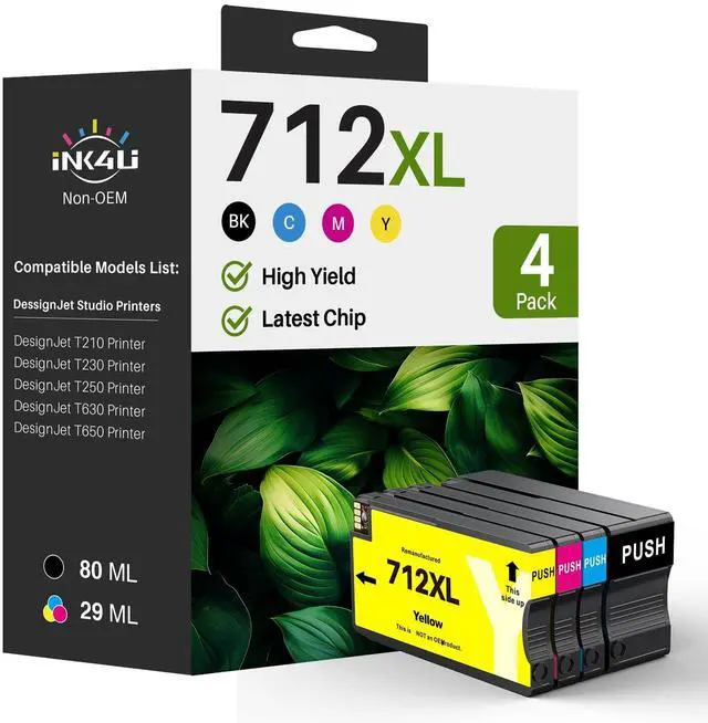 Package Includes: 4 new 712xl 712 ink cartridges 1 712 712xl black, 1 712xl cyan, 1 712xl magenta, 1 712xl yellow ^^ 4. Cartridge Yield (approx. ): 80 ml for 712xl 712 black and 29 ml for 712xl 712 color (at 5% coverage of A4 paper) ^^ 5.