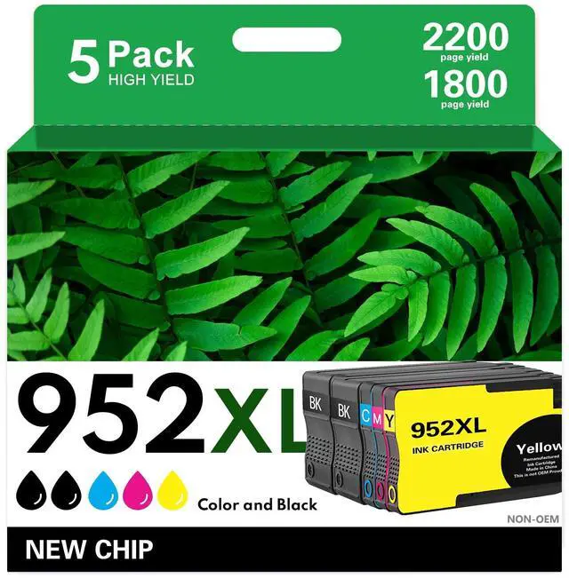 High YieldOur 952XL cartridges offer ~ 2.5 -3x more capacity than standard ones. The 952 XL black cartridge prints up to 2, 200 pages (great for documents), while 952 XL cyan/magenta/yellow each hit 1, 800 pages (ideal for colorful graphics/photos)cutting frequent replacements. ^^ Package ContentsThis 5-pack combo pack has 2x 952XL black, 1x 952XL cyan, 1x 952XL magenta, 1x 952XL yellow cartridge, plus a user guide. Everything you need is in one boxno extra buys, and easy setup for all users.