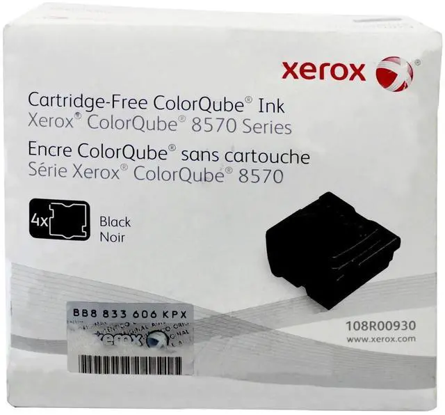 Xerox ColorQube 8570 Black 4 Ink Sticks Solid Ink (8, 600 Pages) - 108R00930 is specially formulated and tested to provide the best image quality and most reliable printing you can count on page after page. Xerox Genuine Supplies and Xerox equipment are made for each other. Accept no imitations. Compatible toners may risk breakdown of Xerox printers and result in poor print quality and weak colors. With over 75 years' experience, Genuine Xerox Supplies are something you can rely on.
