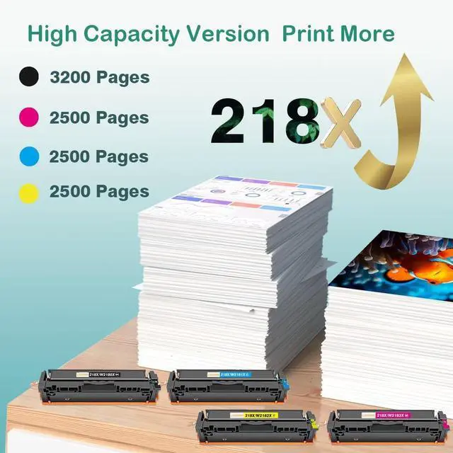 Pages Yield: 3200 Pages for hp 218x black toner cartridges, 2500 Pages for hp218 toner cartridges color(magenta/cyan/yellow, at 5% coverage on A4 paper)