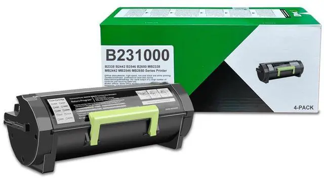 Packaging includes1 Pack B231000 Black Toner Cartridge ^^ High print volumeUp to 4, 000 pages per B231000 black toner cartridge At 5% Coverage (Letter/A4) ^^ Compatible printerC2325dw B2650dn, B2338dw, B2442dw, B2546dw, B2650dw, MB2338adw, MB2442adwe, MB2546ade, MB2650adwe Printer ^^