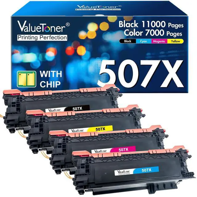 Contents: 4-Pack of Valuetoner 507X Toner cartridges Compatible for HP 507X, for HP 507A (1 Black, 1 Cyan, 1 Yellow, 1 Magenta) ^^ Valuetoner for HP 507X tonet cartridge works with: HP Enterprise 500 color M551dn M551n M551xh MFP M575dn MFP M575F, Pro 500 color MFP M570dn 570dw, Enterprise 500 color Flow MFP 575c Printer ^^