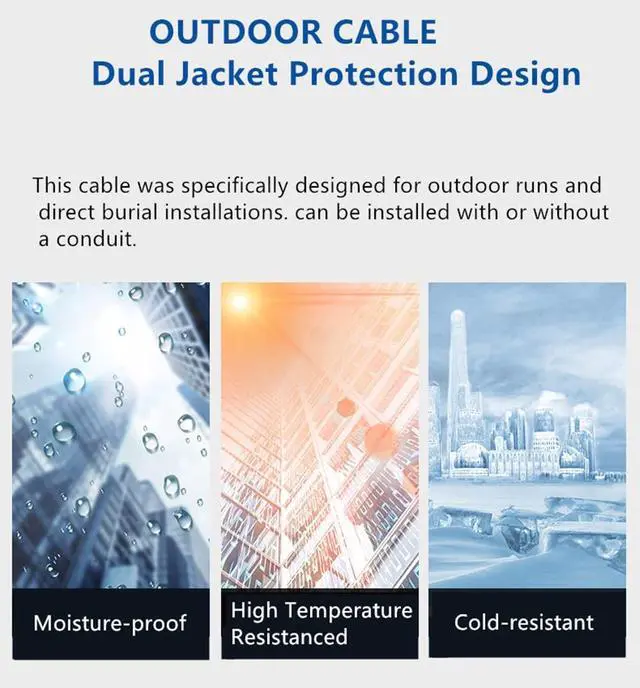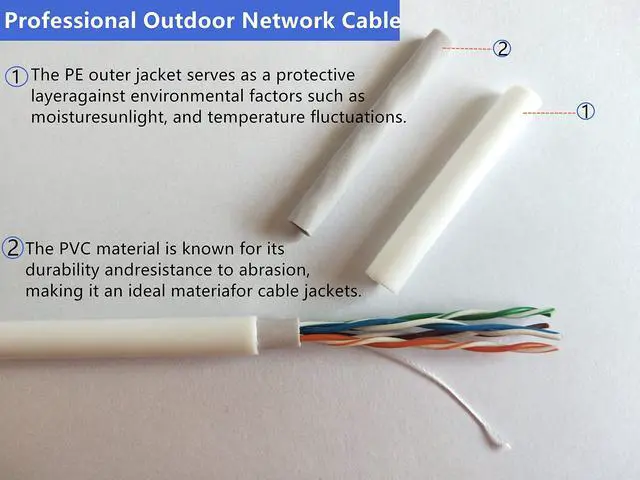 Durable and versatile: Our outdoor Cat5e Ethernet cable is double-jacketed with a weather-resistant PE outer layer and a tough PVC inner layer, making it suitable for direct burial in ground and walls. It features a copper-clad aluminum conductor for improved conductivity and a maximum bandwidth of 350 MHz.