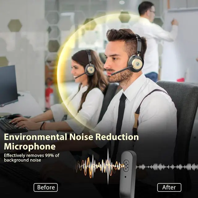 Comfort & 45-Hour Talk TimeExperience all-day comfort with lightweight design (125g) of the wireless headset with mic for work. Featuring soft memory foam ear cushions, 180 rotatable ear cups, and a 270 adjustable noise-canceling mic for a perfect fit. Just 2 hours of charging delivers up to 45 hours of talk time or 1 week on standby. ^^ Advanced Chip & USB DongleThe wireless headphones with mic equipped with Bluetooth 5.3 and a Qualcomm QCC3034 chip for fast, stable connections to PCs, laptops, and smartphones. Includes a USB dongle for seamless wireless use with non-Bluetooth devicesenjoy minimal delay and reliable performance.