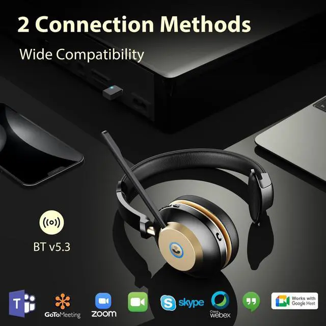 ^^ AI Noise Cancellation & Mute ButtonAI technology of wireless headphones with microphone filters out 99.6 % of ambient noise for crystal-clear calls. Instantly mute with one touch for privacy. Enhanced by 40mm audio drivers, the bluetooth headset is perfect for call centers, meetings, remote work, and online classes. ^^ Dual Connectivity & Charging BaseConnect to two devices at once and move freely with a 49ft wireless range of bluetooth headset with microphone. Charge conveniently via the included base or USB-C cable for nonstop productivity. ^^ Broad Compatibility & Reliable SupportThe 2026 bluetooth headphones upgraded headset works with major UC platforms like Zoom, Teams, Avaya, Skype, and more.