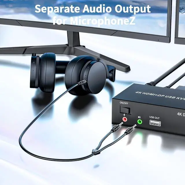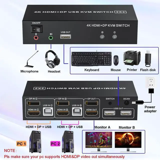KVM Switch Dual Monitor: This KVM switch 2 computers 2 monitors help you to control 2 computers or laptops by only one set of wired keyboard and mouse. 2 PCs sharing a printer, keyboard, mouse, microphone and audio. Additional USB 2.0 x3 for printer, keyboard and mouse ^^ 4K@60Hz