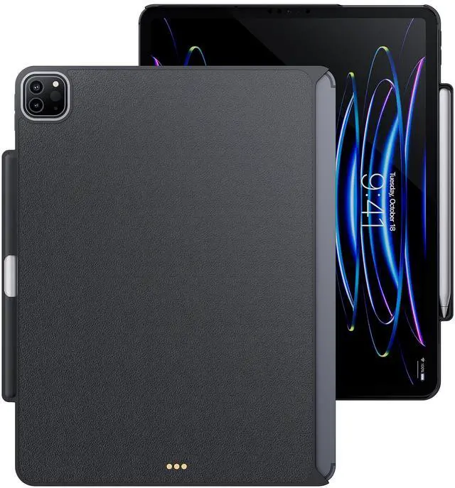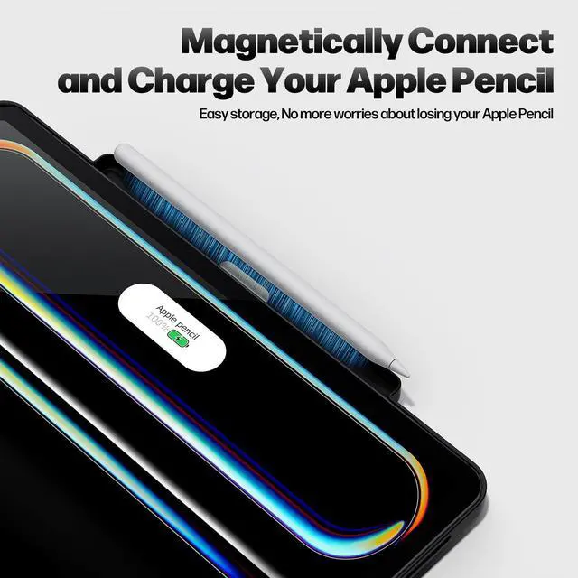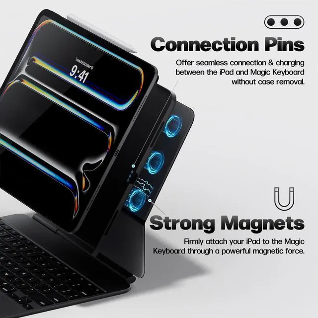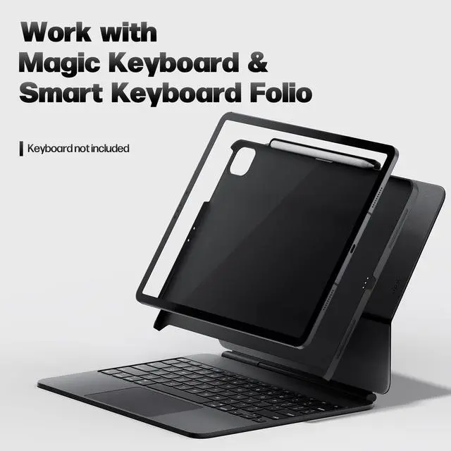 (Note: We do not recommend using a tempered glass screen protector for iPad, as it may prevent perfect keyboard alignment. ) ^^ Comprehensive Protection & Seamless Fit Three-sided wraparound design provides daily protection for the back and sides of your iPad Pro, preventing scratches. One side-open structure allows seamless integration between the iPad Pro and the Magic Keyboard. The metallic camera ring shields the lens from scratches. Precise cutouts offer easy access to all buttons, ports, speakers, and the camera, ensuring full functionality without obstruction. ^^ Pencil Slot & Charging for Apple Pencil Never lose your Apple Pencil again. The top of iPad case features a secure stable pencil holder allowing you to easily take the stylus out for use and store whenever needed. Supporting magnetic attachment and charging for your Apple Pencil Pro or Apple Pencil (USB-C). ^^ Ultra Silm & Portable The magnetic case for iPad is made from lightweight, durable and deformation-resistant PC material, protecting your iPad from scratches and abrasions. The PU style back adds a sophisticated touch. At just 0.05 inches thick and weighs 0.27 lb, this iPad Pro/Air case is ultra slim and portable.