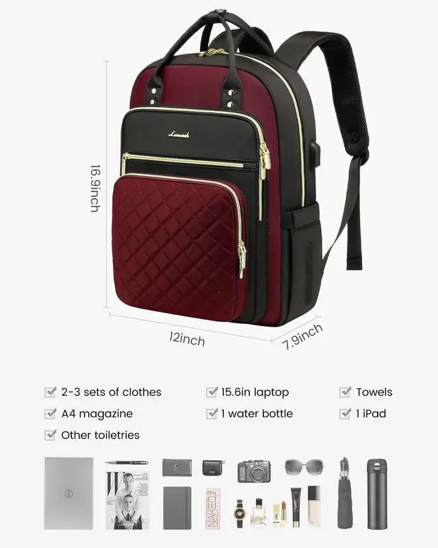 • With a total weight of 1.7 lbs, a capacity is about 26L, and dimensions of 16.9 x 12 x 7.9 inches (H x L x W), this backpack can hold laptops of 15.6 inches and below. It easily accommodates your daily needs or items required for a three-day trip
