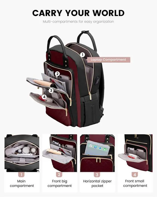 • : This backpack features ergonomic breathable mesh shoulder straps and a large quick-grab top handle. With 18 pockets, multiple compartments, and multiple pocket divisions, you can keep your items organized and easily find what you need. It is ideal as a work, college, or travel backpack