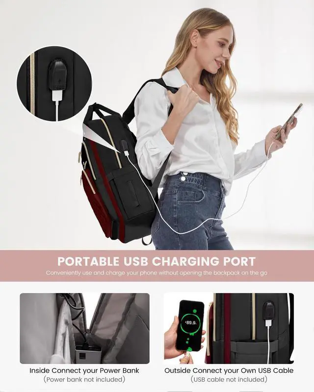 Protection Design: The laptop compartment features thickened EVA foam padding, which provides excellent buffering and protection for your laptop. It also includes a shock-resistant strap to secure the laptop, preventing it from sliding and bumping ^^: The safety pocket on the back is close to the user's body, protecting important items such as wallets and passports. The luggage strap on the back of the backpack allows you to slide it over and fix it onto the luggage handle, reducing pressure on your back ^^ The USB interface with built-in cable design is incredibly convenient for charging your electronic devices by connecting your own power bank (not included). This feature frees your hands on the go