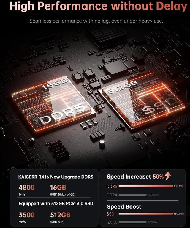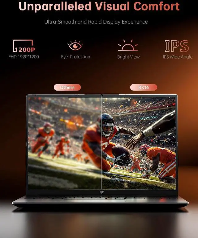 ENGINEERED FOR SPEEDThe KAIGERR 2026 RX16 light-gaming laptop is equipped with the powerful AMD Ryzen 7 7735HS processor (8C/16T, up to 4.75GH z), delivering superior performance and responsiveness. This upgraded hardware ensures a smooth experience, fast loading times, and high-quality visuals. It provides an immersive, lag-free experience. Its performance is far moere than 30% better than AMD R7 5700U/5800U/5825U/6600HX. ^^ 16" High-Definition IPS ScreenWith its wide color gamut and high refresh rate, this AMD light-gaming laptop delivers smoother visuals and sharper detail, offering a more vivid and accurate representation than standard displays.