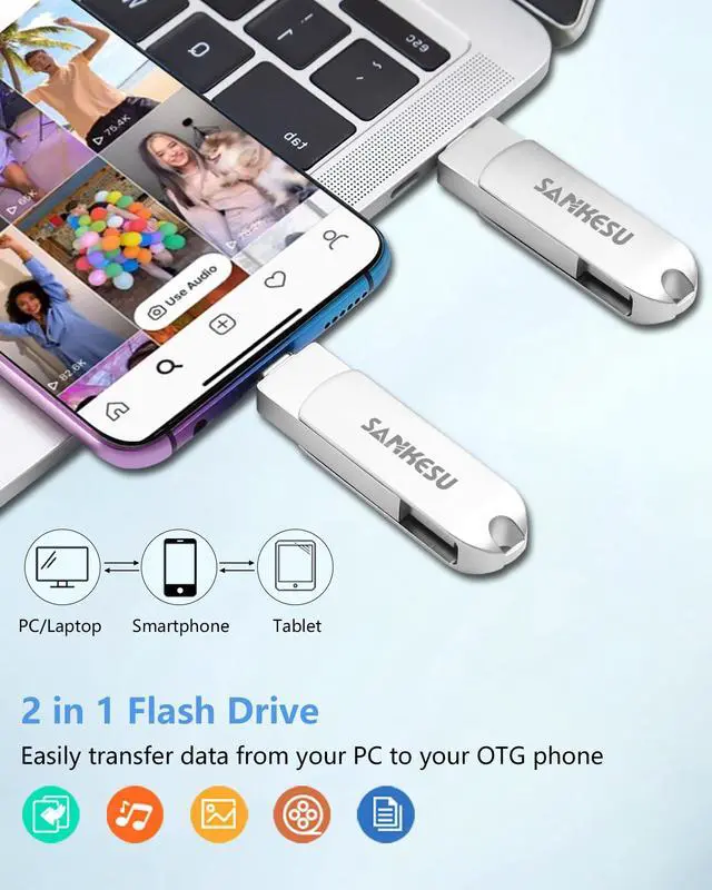 Flash Drive: The SANKESU USB C flash drive 1TB with Type A and Type C interface, quickly move files, pictures or movies between Android Phone and tablet/Mac/PC/car audio/smart TV.