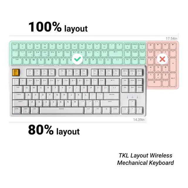 RGB: Thick 1.5 mm PBT keycaps resist oil and shine, while translucent doubleshot molding amplifies 16.8M -color RGB effects (8 preset modes + custom gradients). Perfect for low-light gaming setups and design studios ^^ Pro-Grade TKL Layout for 20%