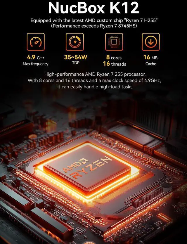 Hardware encoding and hardware decoding of the most common video codecs (AV1, AVC, HEVC) is also no problem; playing the latest games on FSR settings without issues. ^^ 16GB DDR5 RAM + 1TB SSD - The K12 mini computer is equipped with Dual 8GB (Total 16GB) SO-DIMM DDR5 5600MHz memory sticks. 1TB PCIe 4.0 SSD and 3x M. 2 2280 expansion slots, each supporting up to 8TB (24TB max). ^^ QUAD SCREEN 4K DISPLAY SUPPORT - K12 Mini PC support 4-screen 4K/8K output via HDMI 2.1 (8K@60Hz), DisplayPort 1.4 (4K@60Hz), and USB Type-C Transfer speed (supporting PD 3.0 /DP 1.4 /DATA).