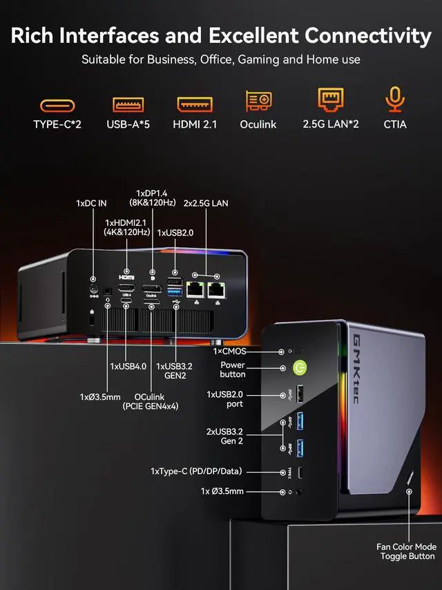 Built-in WIFI 6E / Bluetooth 5.2 is more stable and efficient to connect multiple wireless devices such as projector, printer, monitor, speakers and etc. ^^ DUAL COOLING FANS WITH LIGHTING - Turbo CPU fan + a massive DDR5/SSD cooling fan deliver silent, ultra-efficient cooling (just 35dB in Quiet Mode! ), while the advanced heatpipes and 360 airflow keeps your Ryzen Mini PC frosty under heavy loads. Plus, 13 dazzling RGB lighting modes let you personalize your rigs vibe. ^^ GMKtec Warranty- GMKtec offers a 1-year limited warranty for each mini PC, starting from the date of the purchase.