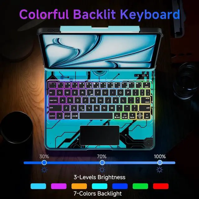 7 Colors RGB Backlit Keys AND 3 Adjustable Brightness Levels The transparent ipad keyboard case comes with 7 different color-coordinated RGB backlit, and the backlit projects beautiful colors through laser-etched key characters and letters. 7 RGB colours backlit keys for comfort and productivity in any dimly lit area.