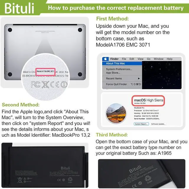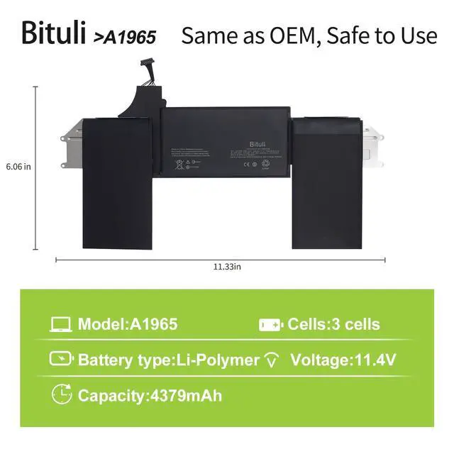 Capacity: 49.9W h/4379mAh. This battery provide the same battery life as the original, We are a professional laptop battery manufacturer, We only provide the best quality batteries to ensure the best possible buying experience for our customers ^^ Compatible ModelsReplacement for MacBook Air 13" 13.3" Late 2018 2019 A1932 (EMC 3184), Early 2020 A2179 (EMC 3302) A1965 Notebook Battery ^^ Compatible Part NumbersCompatible with MacBook Air A1965 020-02459 A1932 (EMC 3184) A1965(3ICP4/63/119) A2179 (EMC 3302) 020-02455 661-11676 Laptop Battery ^^ Bituli QualityAll of Bituli products are Certified by CE, FCC, RoHS and UL for safety. Strict guidelines for compatibility, and standards compliance for environmental safety. Bituli battery packs are comprised of grade "A" cells with top quality ion battery materials that ensure Reliable performance extended battery life ^^ Bituli Support24 x 7 Email support, Rest assured with 30 days Refund12 months Replacement, For any other problems or advise please feel free to contact us, If you are not satisfied for any reson please let us konw, we promise to deliver you a FAST resoluton