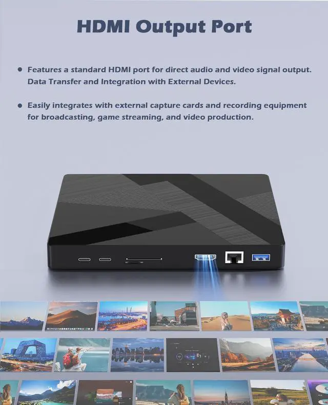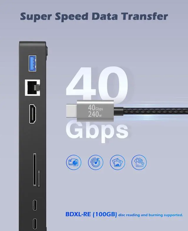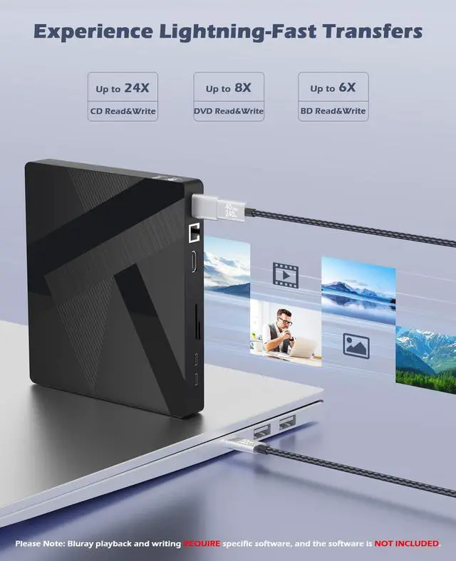 Master 100GB Rewritable Discs This external Blu-ray writer is engineered for professional-grade storage, supporting - discs. Perfect for creating reusable, large-capacity archives for massive data backups, video projects, or entire media librariesoffering unparalleled flexibility and value. ^^ High-Speed USB Type-C Cable Included Comes with a high-quality Type-C cable, designed to deliver maximum performance for fast file transfers and smooth Blu-ray playback, ensuring a premium user experience. ^^ HDMI Port for Enhanced Playback The built-in HDMI port works in conjunction with supported Blu-ray playback software on your computer to facilitate decoding and output of protected commercial Blu-ray content, ensuring compatibility and a high-quality playback experience.