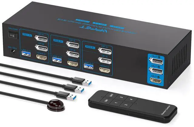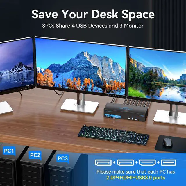 KVM Switch 3 ComputersThe HDMI Display port KVM Switch allows 3 PC or laptops to share 3 monitors and 4 USB peripherals, such as keyboards, mouse, printers, scanners, USB flash drives, etc. For users with 3 computers, it can be a great cost-saving solution and takes up little space, making it easy to centralize. You can switch between the 3 computers at will, making your desktop neater and improving your work efficiency.