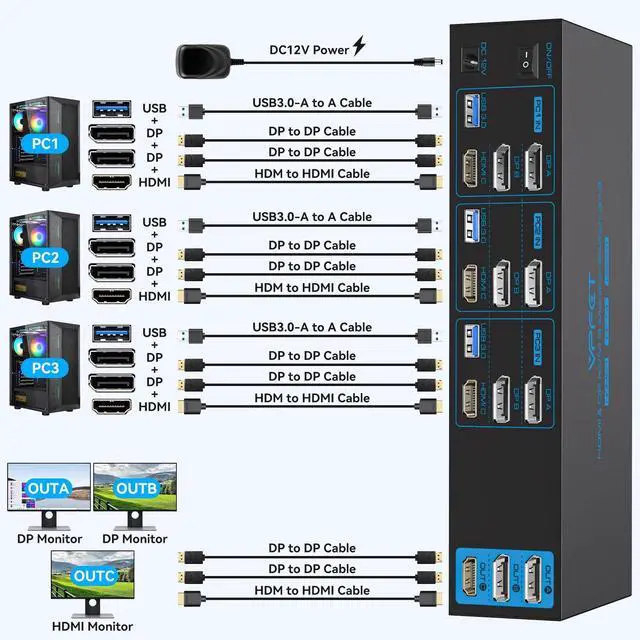 Note: This KVM switch must be connected to a DC 12V power adapter for proper operation. ^^ Purchase InstructionsIf you are unable to confirm the compatibility of this DP KVM switch before purchase or find that you are unable to use it after purchase, please provide us with the video ports for each of the 3 computers and 3 monitors, and we will recommend the most appropriate KVM switch for your computer configuration.