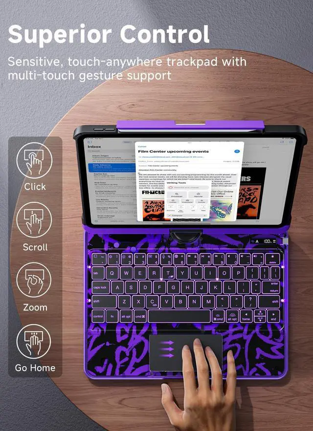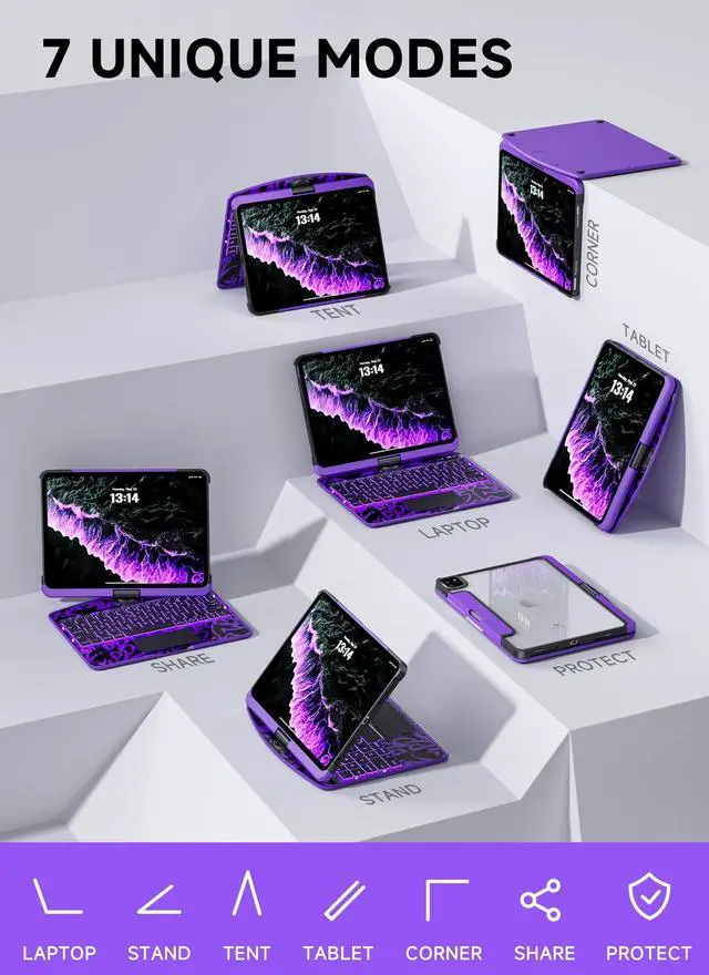 LCD Power Display: The integrated LCD power display shows battery status at a glance, helping you stay informed throughout the day. A 7-color backlit keyboard with 3 brightness levels ensures comfortable typing in any lighting, while 14 iPadOS shortcut keys offer quick, one-touch access to volume, brightness, and media controls. ^^ Crystal-Clear Design with