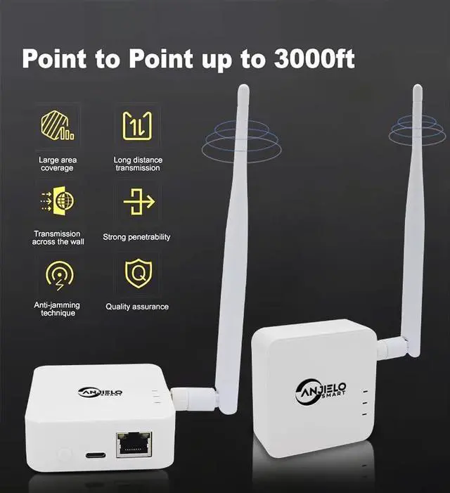 AnjieloSmart AH68066 wireless bridge is along-distance HaLow wireless transmission device. It uses wireless communication technology to transmit network data using air as a medium to perform long-distance point-to-point or point-to-multi point interconnection. The working data link layer realizes the interconnection of local area networks. The transmission distance can reach up to1km. AH68066 wireless bridge transmission usually consists of two devices, one is TX, the other is RX, in the process of using, one end will be connected to the router, the other end is connected to the terminale quipment, no need to pair, can be used.