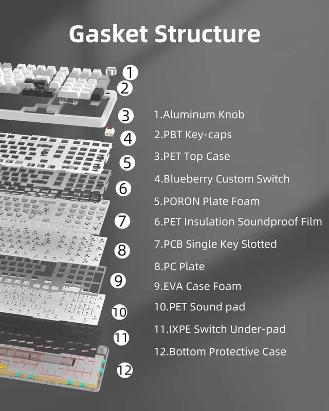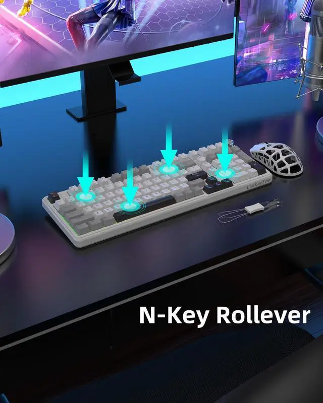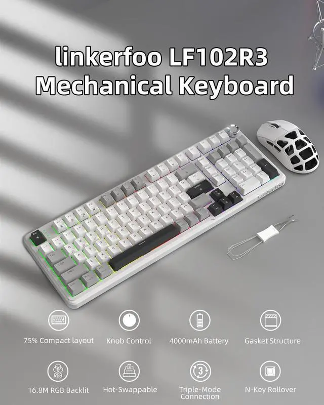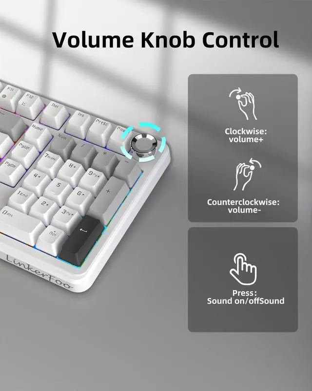 Seamless Multi-Device ConnectivityThe Linkerfoo LF102 mechanical keyboard offers three connection modes: Bluetooth 5.0, 2.4GH z wireless, and USB wired. Connect up to five devices simultaneously and switch between them effortlessly with the FN key and a dedicated side button. This versatile keyboard adapts perfectly to your needs, whether you're working, studying, or gaming. ^^ Intuitive Multi-Function Control KnobFull size compact keyboard features a versatile control knob for quick adjustments. In multimedia mode, rotate to control the volume or click to play and pause. ^^ Hot-Swappable CustomizationCustomize your keyboard with ease. This hot-swappable keyboard is compatible with both 3-pin and 5-pin switches, allowing you to replace switches and keycaps without any soldering (keycap/switch pullers are included). The pre-lubed blueberry switches offer a smooth typing feel and creamy sound, providing fast and reliable response for intense gaming. ^^ Advanced Structure for Superior FeelThe LF102 features an advanced internal structure with an integrated silicone pad and a PCB single-key slotted design. This enhances flexibility and stability, giving you a softer and more elastic typing experience. The five-layer sound-dampening foam effectively fills internal gaps to eliminate hollow noise, resulting in a solid, satisfying feel with every keystroke.