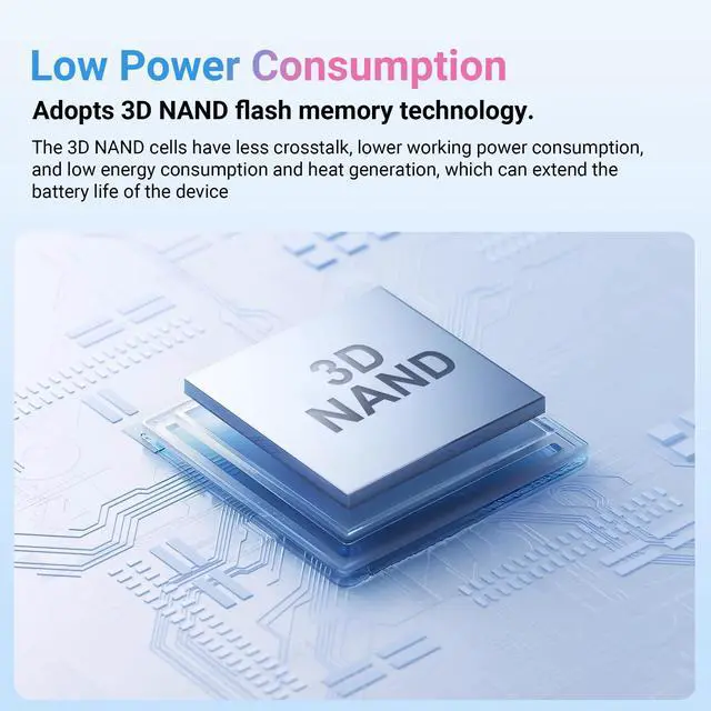 • Low Power Consumption:The 3D NAND structure is like building a vertical skyscraper for data, with cells orderly arranged and minimal interference. This allows it to process data like a logical, precise, and calm brain, completing all tasks with extremely low power consumption, "whispering quietly," and reserving more energy for thinking (CPU) and creation (GPU) rather than wasteful heat generation and consumption.