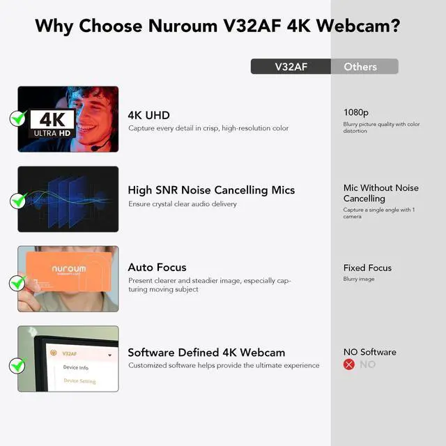 Built-in Noise Canceling Microphones: Enhance your audio experience with our external webcam, equipped with two integrated microphones capturing natural and clear sound within 10ft. Empowered by a compressed neural network on consumer chipsets, the noise-canceling algorithm efficiently blocks out unwanted sounds like keyboard tapping. Ideal for home office use and business calls, even in noisy environments. (For example, in a Zoom meeting using V32AF, select it as the video and audio source. ) ^^ Automatic Light Correction & Easy Setup: V32AF 4k webcam ensures high-quality images in any lighting condition with automatic exposure correction. Alternatively, fine-tune parameters like brightness and saturation in NearSync to suit your preferences. Setup is a breeze simply plug in the USB cable. With three mounting options - on the desk, on a monitor or laptop, or on a stand or tripod - versatility meets simplicity.