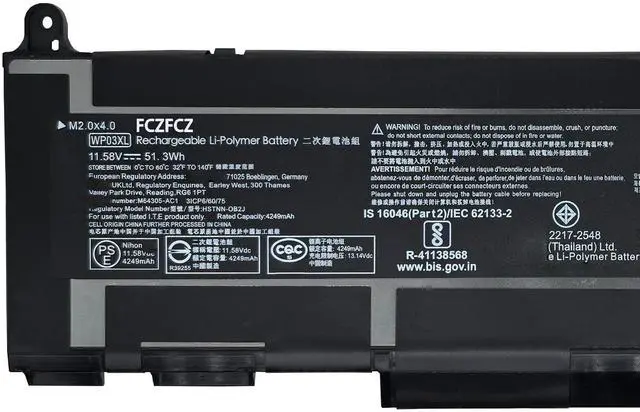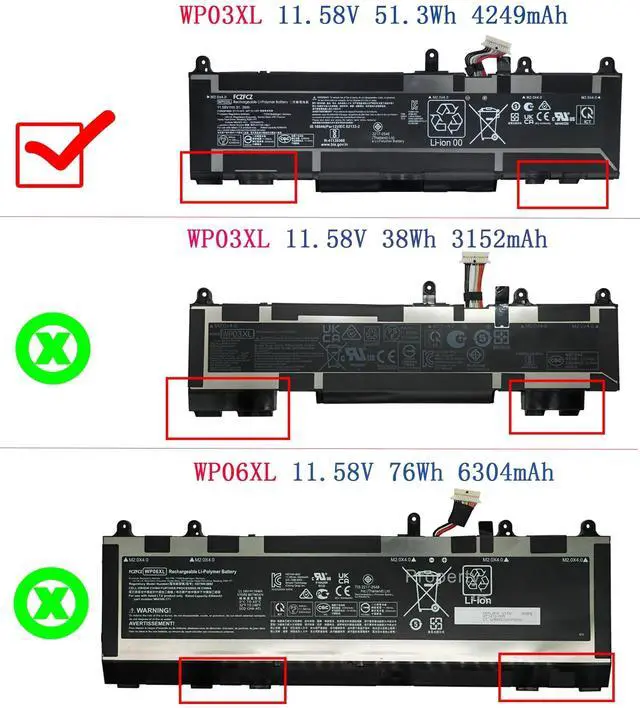 Condition: Brand New. ^^ Replacement for Part NumberWP03XL WP03038XL WP03040XL WP03051XL WP03054XL TPN-DB0P TPN-DB0J TPN-DB0Q TPN-DB0S HSTNN-0B2J HSTNN-LB8W HSTNN-LB9C L78555-005 M64304-2C1 M64304-2D1 M64304-422 M64305-2C1 M64305-421 M73466-005 M75019-2C1 M75019-2D1 M75020-2C1 31CP6/60/75 (NOTE: The WP03XL battery has two different capacities (38Wh and 51.3W h), their appearance is different, and they are incompatible with each other. Before purchasing, we strongly recommend that you open the back cover of the laptop to make sure that the battery type you want to buy is the same as the one described in the picture. ) ^^ Compatible with Machine Modelsfor HP Split X2 13-M00 series; for HP EliteBook 830 G9 series; for HP EliteBook 830 G10 series; for HP EliteBook 835 G9 series; for HP EliteBook 835 G10 series; for HP EliteBook 840