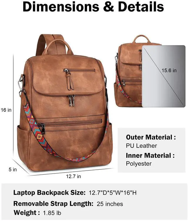 Quality Materials: 12.7"W *5"D*16"H, 1.85 lb. This women's leather laptop backpack is made of the latest waterproof PU vegan leather, soft and retro, quality hardware, smooth zipper without sticking, and reinforced design at the connection between the shoulder strap and backpack, making the leather backpack more durable. So this is a sturdy and stylish laptop backpack.