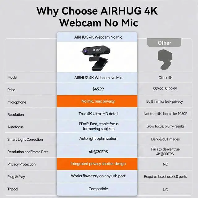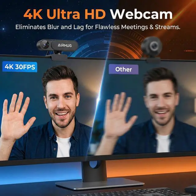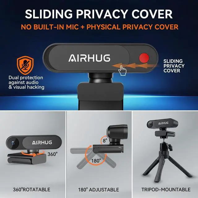 Golden View: Focus on Your Personal ImageA fixed 63 golden view (FOV) perfectly focuses on your head and shoulders. Compared to a wide-angle lens, AIRHUG 23 webcam effectively reduces background clutter, creating a clean and professional meeting atmosphere even in small home office spaces, without worrying about compromising your privacy ^^ True Plug and Play & Wide CompatibilityUSB plug and play, no drivers or software required, setup complete in seconds. This versatile 4K usb webcam is fully compatible with Windows 10/11, macOS, and major platforms including Zoom, Microsoft Teams, Google Meet. Great for remote work, online classes, streaming, and beyond ^^ Super Mini & Lightweight, Portable & FoldableAIRHUG 23 features adjustable universal clip with 1.6 m usb power cable that fits to laptops, desktops, computers, mac, pc, lcd monitors. The 360 mounting clip rotative axis make the webcam easy to shot from any angle. And you can also choose a webcam tripod clip for the webcam meeting multi-angle needs. The convenient foldable design allows you to easily take it anywhere