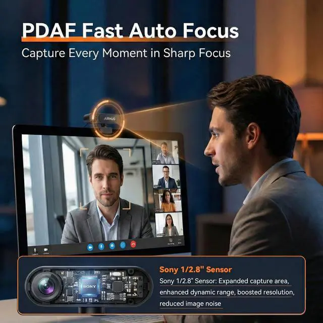 Extreme Privacy: No-Mic & Physical Privacy Cover Designed for high security environments, this 4k web camera features a no microphone hardware design to completely eliminate the risk of audio hacking or unauthorized listening. Combined with an integrated physical privacy cover, you have total control over your digital life, ensuring no "sneak peeks" or eavesdropping during or between meetings ^^ 16MP Ultra 4K Visuals with Sony SensorPowered by a professional Sony 1/ 2.8 '' CMOS sensor, this pc webcam delivers stunning 4K resolution at 30FPS and crystal-clear 16MP static images. With a larger sensor surface, it captures 70% more light than standard webcams, providing exceptional color accuracy and image depth for high-end professional presentations ^^ PDAF Millisecond Fast Focusing Experience high-speed Phase Detection Autofocus (PDAF) that locks onto subjects in as little as 0.35 seconds. Unlike traditional contrast-based focus, this 4K camera instantly locks onto your face and maintains a clear and sharp image even as you move or approach. It ensures you remain the center of attention throughout your stream or meeting, eliminating distracting focus "searches" so you always look your professional best ^^ Intelligent Auto Light BalanceNever worry about poor lighting again.