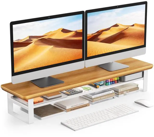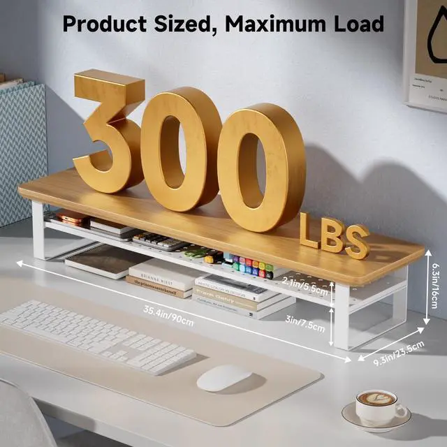 Large Monitor StandMeasuring 35.4"L x 9.3"W x 6.3"H, this expansive monitor stand offers a wide and stable platform capable of holding dual monitors, a laptop, and even a TV simultaneouslyperfect for both multitasking and entertainment setups. It transforms your desk into an organized, clutter-free command center that maximizes productivity and enhances your visual experience. ^^ 2-Tier Desktop OrganizerThe desk shelf features a smart two-tier design that instantly doubles your usable space. The top tier elevates your monitors or laptop to an ergonomic height, while the lower tier provides organized storage for accessories, documents, and tech gear.