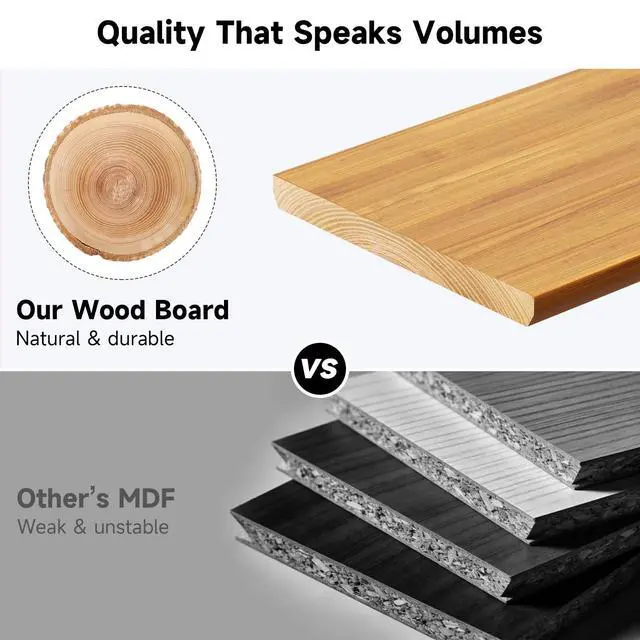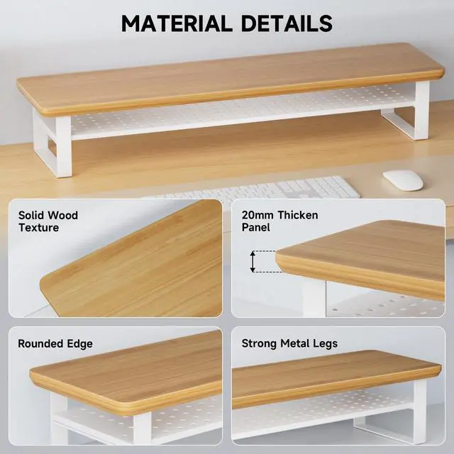 With an open-back design for easy cable management, it transforms cluttered desks into clean, productive workspacesperfect for home offices, gaming setups, or shared workspaces. ^^ Strong & Stable DesignBuilt from high-quality wood and metal, this monitor stand features a thickened 20mm ( 0.79 inch) panel that provides robust support for loads up to 136kg (300lbs). Engineered for lasting stability, it offers secure and wobble-resistant support for your monitors. Additionally, the smooth rounded corner design ensures safe handling, preventing bumps or scratches during use. ^^ Ergonomic Design Monitor StandOur monitor stand is ergonomically engineered to lift your screen to the ideal viewing height, aligning with your natural eye level to promote healthy posture.