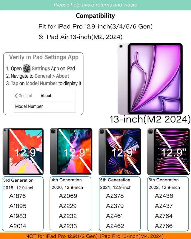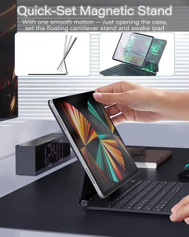 Compatibility: Compatible with iPad Air 13"(2024 - A2898/A2899/A2900, 2025 - A3268A3269A3271), 2022 iPad Pro 12.9" (6th gen - A2436/A2437/A2764/A2766), 2021 iPad Pro 12.9" (5th gen -A2378/A2379/A2461/A2462), 2020 iPad Pro 12.9" (4th gen - A2069/A2229/A2232/A2233), 2018 iPad Pro 12.9" (3rd gen - A1876/A1895/A1983/A2014). Please hlep to avoid returns and waste, kindly verify compatibility by checking at the back of your iPad or navigating to Settings > General > About. ^^ Quick-Set Stand & Floating Cantilever Design: Enjoy quick and easy iPad installation and removal with our ipad pro 12.9 inch keyboard case. The Floating Cantilever Stand provides stable and lightweight support, transforming your iPad into a versatile touchscreen laptop. ^^