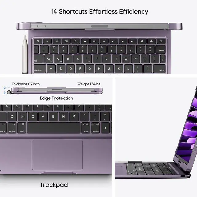^^ &: Transform your iPad keyboard case into portable laptop, revolutionize your workflow. With the 360 hinge (20, 000-cycle stress tested), rotate the screen at any angle and use it for any task from typing to watching, tent to tablet mode and more.