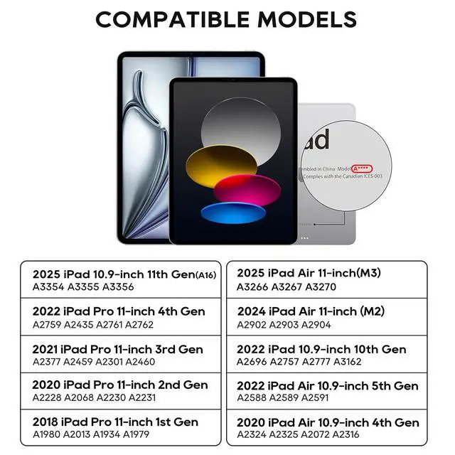 : Pekarejue wireless keyboard case is compatible with Apple 2025 iPad 11th (A16) Gen (A3354 A3355 A3356). 2022 iPad 10th Gen (A2696, A2777, A2757). iPad Air 11-inch M3 2025 (A3266 A3267 A3270). iPad Air 11-inch M2 2024 (A2902 A2903 A2904), 2022 iPad pro 11-inch 4th Gen (A2435, A2759, A2761, A2762)2021 iPad pro 11-inch 3rd Gen (A2377, A2301, A2459, A2460), 2020 iPad pro 11-inch 2nd Gen (A2228, A2068, A2230, A2231), 2018 iPad pro 11-inch 1st Gen (A1980, A2013, A1934, A1979), 2022 iPad air 5th Gen (A2588, A2589, A2591), 2020 iPad air 4th Gen (A2072, A2316, A2324, A2325).